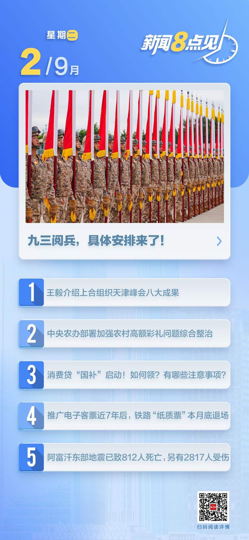 [目前的数字]会议和艺术之夜纪念日本抵抗侵略的80周年,世界反法西斯主义战争将于9月3日在北京举行。当天上午9点,在北京的蒂安曼广场举行了纪念会议。 CPC中央委员会秘书长,中华民国总裁兼中央军事委员会主席习近平将发表重要的演讲并审查军队。晚上8点那天,文学之夜“维多利亚·德拉·贾斯蒂亚(Victoria de la Justicia)”纪念中国人民抵抗日本入侵的胜利80周年,并将在北京大会上举行反法西斯战争的胜利,并将在北京大会上举行,并将被XI Jinping和其他助手和其他助手看到。 (新华社)阅读全文>>> 9月3日的军事游行将暗示某些安排军事游行和THE游行QIT持续约70分钟。其中,在军事游行期间,游行队伍在Chang A道路上保持一致,并因受到CPC中央委员会秘书长Xi Jinping的审查而受到赞誉,中央委员会中央委员会总裁兼总裁。二分过程以天堂旗保护步骤,远足步骤,战斗旗,设备的设备和空中步骤的顺序穿过天安门广场。 (CCTV新闻)阅读全文>>> Wang Yi提出了SCO Tianjin Summit的八项成就。 2025年9月1日,在政治局成员和CPC中央委员会外交大臣王伊(Wang Yi)的SCO天津峰会结束时,我在SCO新闻中心会见了秘书长SCO Yermekbayev,以回答问题。 Wang Yi提出了在峰会上实现的八项主要成就。 (延伸事务部)阅读全文>>> MEMBE的领导人上海合作局的R州,并发布了“上海合作局董事会的天津宣言”。上海合作局成员国的领导人已签署并发布了“上海合作局负责人的第二实例理事会宣言”。 (CCTV新闻)阅读全文>>>详细信息:上海合作机构吉尔吉斯斯坦成员将从2025年至2026年接任上海合作局主席,首先,首先,郭吉·吉·吉(Guo Jakun确保印度尼西亚中国机构和人员安全的措施。 (新华社)阅读全文>>>正在实施中央农村办公室,以改善农村地区高价值婚礼礼物的整体修正案。整体修订在农村地区,高价值新娘的礼物是与该党中央委员会有关的人们的生活。区域中央工作组的办公室将加强其部署,并促进对农村地区高价值新娘礼物的整体修正案的实施和有效性。 (新华社)阅读全文>>>“国家补贴”已正式推出给消费者的贷款!如何获得它?什么是预防措施? 9月1日,正式推出了用于消费贷款的“国家补贴”! 8月12日,财政部,中国大众和国家金融监管管理局共同发布了“实施个人消费贷款的财务利益实施计划。财务利益补充消费。在本月底完成。或铁路将于9月30日取消。9月1日,诸如互联网泛滥的新闻。实际上,自2024年11月1日以来,已经在我国的铁路乘客的运输领域中完全实施了电子票。乘客的运输领域。乘客的运输领域。实际上,在电路牌上供电的售票员,可以在电路牌上打印出来,实际上是在电路上打印了一张公共汽车。报销优惠券,而不是培训门票。F 9.43亿乘客比上一年增长了4.7%,而国家铁路的负载量为7.2亿吨,比上一年增加了4.8%。在同一时期,乘客和货运量都达到了最大记录,安全,稳定和有序的铁路运输。 (中国铁路微信的官方帐户)阅读9月2日的全文>> [当地],一些北京地铁将被暂停并提前关闭。为了确保在纪念对日本的抵抗战争80周年的会议上的安全和柔和进步,记者从北京的运输和交通管理部门中学到,自9月2日晚上以来,一些北京地铁站将提前暂停,相关的道路将采取临时时间和部门交通管理措施。 (北京新闻)阅读全文>>> [社交]一个女孩在动物园中与动物园互动时被咬伤。这Pinnán广东话的文化和旅游部干预了管理。 8月30日,这位7岁的女孩在参加“与小老虎的亲密互动”项目时被3个月的老虎咬伤。 9月1日,女孩的母亲芬恩(Fenn)告诉记者,这个男孩接受了他的第一次愤怒疫苗,将来需要另外四枪。目前,她和动物园尚未就薪酬达成协议。 Pinnan县党委员会的Divis StaffPropaganda ion告诉记者,当地的文化和旅游局进行了干预。 (北京新闻)阅读全文>>> Yuncheng的老人Shanxi在一个老人的家中被殴打。涉及的人员由警察控制。 9月1日,西安(Shanxi)的Yuncheng的新闻记者在8月22日说,他的85岁的母亲在Wenkshi County的Peishtown的一所老年家中。 9月1日,记者了解到皮什市政府警方干预了调查,并被警察控制。此外,市政府还组织了相关员工,通过司法渠道来联系家庭,并帮助家庭保护其权利和利益,并正确地应对随后的问题。 (北京新闻)阅读全文>>> [财务]上海抵押贷款的兴趣调整已经开始!一些住房买家将第二宫的利率调整为第一宫。 9月1日,开始对上海抵押贷款的利率进行新的调整。上海抵押贷款客户于9月1日告诉记者,他完成了将现有抵押贷款从第二抵押贷款利率调整为银行移动申请的当前抵押贷款利率的运营。利率已从前面的3.45%(LPR-5bp)降至3.36%(LPR-14BP),减少了9个基本点。 (北京新闻)阅读完整的故事>>> [文化Al and Sports] Leahon团队的资深人士Hanede Jun向职业篮球场说再见。 (新华社新闻社)阅读全文>>>我夏季2025年的电影的票房收入为11966亿元人民币。国家电影办公室于9月1日启动了数据。从6月1日至8月31日,我2025年夏季国家的电影筹集了1,1966亿元人民币,观众为3.21亿。 (新华社)阅读全文>>> [国际]霍蒂军队为一名在以色列空袭中去世的高级官员庆祝了葬礼。已释放了死者的清单。 9月1日,胡蒂(Houthi)的军队为一名高级官员庆祝了一场葬礼,该官员上周在以色列空袭中死亡,并启动了死者名单。其中包括“变革与建筑总理”,“水资源”,“局”,“能源和水 – 和”,“能量和水”和“青年和体育部长”,“总理办公室总监”和“ Secre”内