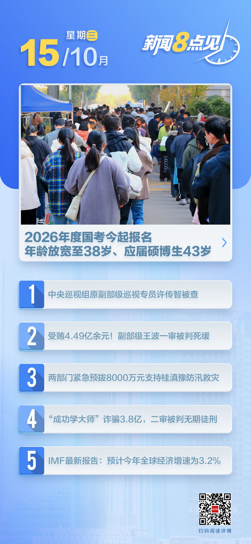 【时事新闻】年龄限制降低至38岁,新硕士、博士生现年满43岁。最新的国家考试招生简章已经发布。 10月14日,2026年部委、中央机关及其直属单位考试公务员录用公告正式公布。记者注意到,公务员考生年龄限制进一步放宽。原则上年龄18周岁以上、38周岁以下(1986年10月至2007年10月出生)。 2026年毕业硕士、博士研究生,年龄限制降至43周岁以下(1981年10月以后出生)。考生将于上午8:00起登录中央部委机关2026年公务员考试录用网及直属机关网上报名。 10 月 15 日至下午 6:00米。 10月24日,(新京报)阅读全文完整故事>>> 阅读更多:一篇文章了解国考三大变化:放宽年龄限制、增加部分职业职业能力考试。商务部发言人就美对中国造船等行业实施301调查限制的情况答记者问。美东时间10月14日,美国根据“301调查”结果,正式对中国海运、物流、造船等领域实施港口关税等限制措施。10月14日,商务部发言人表示,“中方对此非常不满和坚决反对”。 10月10日,该公司宣布将对具有美国特色的船舶实施关税特殊港口限制,例如悬挂美国国旗、美国制造、所有权、参与和运营等。 (商务部)阅读全文>>>原副部长级徐传志l 中央巡视组主管因涉嫌严重违纪违法接受调查。目前正接受中央纪委、国家监委纪律审查和监察调查。 (中央纪委国家监委网站)内蒙古自治区人大常委会党组副书记王波收受贿赂4.49亿余元。一审判处他死刑,缓刑。 2025年10月14日,湖北省宜昌市国际人民法院对内蒙古自治区党组副书记、人大常委会原副委员长王波涉嫌受贿罪公开作出一审判决。王博受贿罪被判处死刑里。缓刑两年,剥夺政治权利终身,并处没收个人全部财产。依法缓期二年执行死刑,一旦减为无期徒刑,将继续服无期徒刑,不得减刑、假释。追缴的王波犯罪所得资产和利息将依法上缴国库,其余部分将继续追缴。经审理,王波涉嫌受贿4.49亿元人民币以上。 (央视新闻)阅读全文 >>> 两部门紧急拨款8000万元,支持广西、云南、河南等省份的防汛抢险救灾工作。近期,广西、云南、河南等地多地发生严重暴雨洪涝灾害。 10月14日,财政部、工信部应急管理部紧急拨付中央自然灾害救助基金8000万元,支持广西壮族自治区、云南省、河南省防汛抢险救灾。用于灾民运输安置、除险、次生灾害风险排查、急救等应急响应。最大限度减轻灾害影响,切实保障人民生命财产安全。 (财政部)阅读全文>>>国家市场监管总局批准公布《中小学教室照明灯具卫生标准》。国家市场监督管理总局(国家标准局)批准发布国家强制性标准《中小学照明及教室卫生标准》。规则已经过审核由国家疾病预防控制局批准,计划于2026年11月1日正式生效。(央视新闻)阅读全文>>柬埔寨警方调查了一起涉及中国公民的安全事件。据柬埔寨西哈努克省警方发布的消息,柬埔寨警方近日调查了一起涉及一名中国公民的安全事件,并逮捕了涉案嫌疑人。 9月20日,西部省警方在京港高速上成功救出两名跳车中国公民。在国家警察局长的领导下,西部省警察局与奥达尔棉吉省警察局密切配合,成功解救了4名受害者(均为中国公民,其中一名女性),逮捕了6名犯罪嫌疑人(均为中国公民,其中一名女性),并收集了大量相关证据。据《韦斯特》报道在省公安厅,这个犯罪组织多年来对中国公民实施非法拘禁、绑架、敲诈勒索、贩卖人口等犯罪活动。目前,西部省警方正在进一步调查该事件。 (中国驻柬埔寨大使馆)阅读全文>>> 【地区】国际友城数量增至287个,扩大了北京的国际“朋友圈”,已传遍世界各地。 10月14日,北京市人民政府报业局召开以高质量完成首都“十四五”规划为主题的国际交流中心专题会议新闻发布会。新京报记者现场了解到,北京二类国际友城数量已增至287个,在世界各地形成了国际“朋友圈”。 (新京报)阅读全文>>>北京警方已破案严厉打击无人机“黑飞”,8月以来共查处违法案件51起。记者10月14日从北京警方获悉,自《北京市人民政府关于公布无人机空域管制范围的通知》发布以来,北京警方已查处非法“暗飞”案件51起,并对举报非法“暗飞”活动的52人进行奖励。 (新京报)阅读全文>>>【社会】一位“成功老师”自称教人如何快速致富,骗走群众3.8亿。在二审中,他被判处无期徒刑。 2023年2月,杨无辰亮相一门名为“超级说服”的课程,获得掌声和欢呼。照片由受访者提供。自称“亚洲第一潜在动力”的杨道明(真名:杨五成)被判处无期徒刑、永久剥夺政治权利、没收财产浙江省宁波市中级人民法院以他的快速培训成功名义诈骗其全部个人财产。近日,浙江省高院就本案作出二审裁定,驳回杨武成的上诉,维持原判。其妻徐慕婷以共犯请求从轻处罚,刑期由有期徒刑12年,并处罚金600万元改为有期徒刑11年,并处罚金100万元。 (新京报)阅读全文>>>私人地下室开挖导致30余户房屋出现裂缝。安徽省霍山市一名商人已被捕。继安徽某村庄私自挖掘地下室导致房屋出现裂缝事件后,记者14日从霍山县有关部门获悉,非法挖掘的业主已被抓获,受损房屋的地基已被修复。加强。今年8月,霍山县一小区业主获悉,该楼一楼业主私自挖掘地下室,发现楼内30余户房屋出现裂缝。 (新华社)阅读全文>>> 【财经】国际货币基金组织发布最新报告:预计今年全球经济增长率为3.2%。当地时间10月14日,国际货币基金组织(IMF)发布新一期《世界经济展望》报