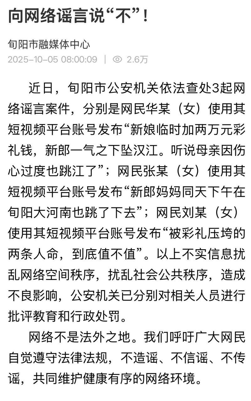根据北京新闻新闻Xunyang Media Center的说法,Xunyang市的公共安全局最近根据法律调查了三起在线谣言。 Netizen Zhang(Woman)用她的简短视频平台帐户出版:“男友的母亲也在同一天下午跳到Xunyang的Henan。”刘(Netizen Liu)(女人)使用她的简短视频平台帐户来解释:“道琼斯指数对谣言所粉碎,这不是谣言,这不是没有权利的地方。